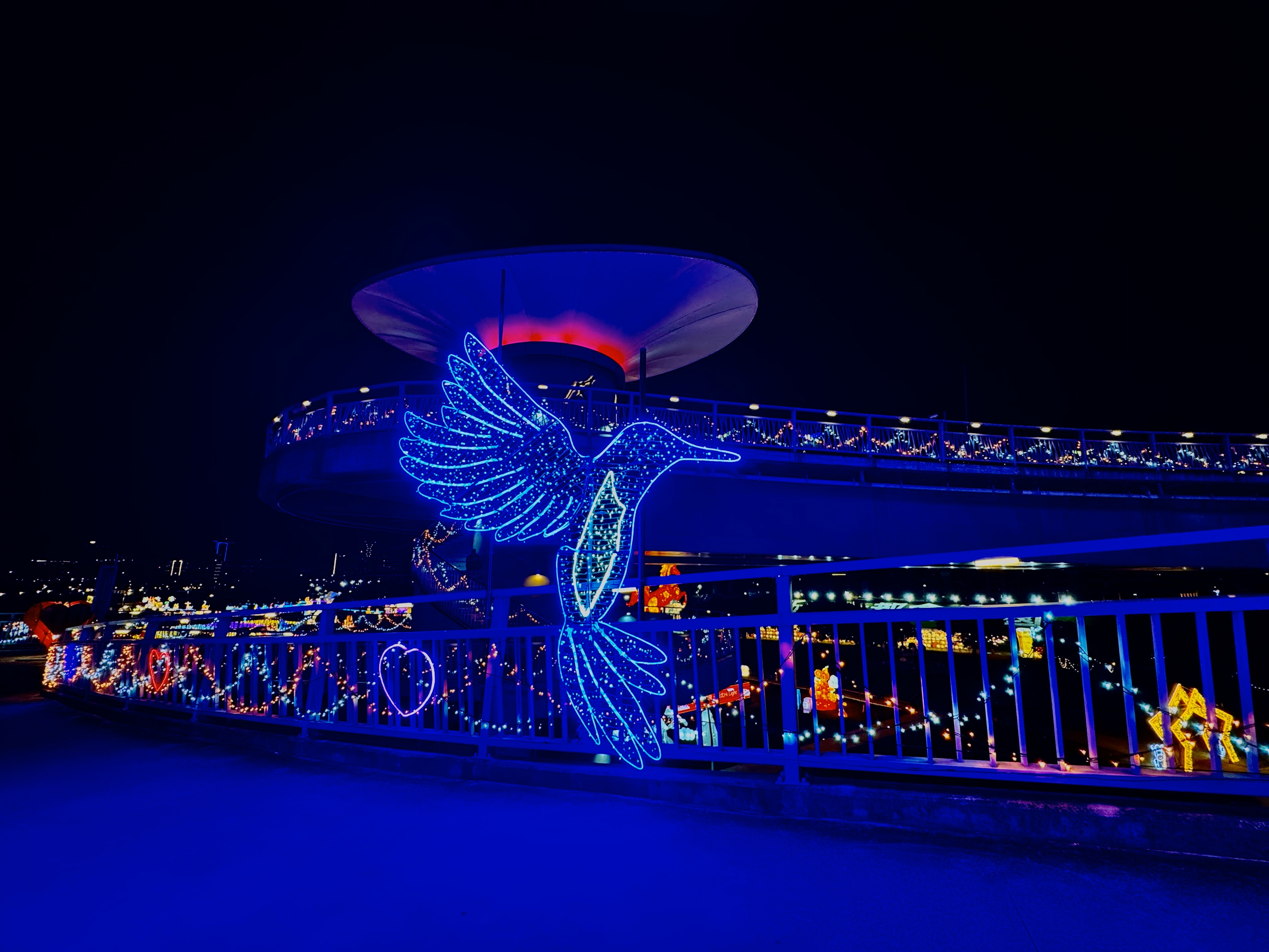 走上辰光橋,光雕主題之一「星戀步橋」以水波紋燈光鋪陳橋面,光影隨腳步流動,如月色輕灑河面,搭配白光與珊瑚橘星星燈串,營造滿滿儀式感;延伸至「星戀草坪座」,柔和燈串搭配飛舞的蝴蝶、蜻蜓燈飾,將成為情侶拍照、親子停留的夢幻打卡點。
