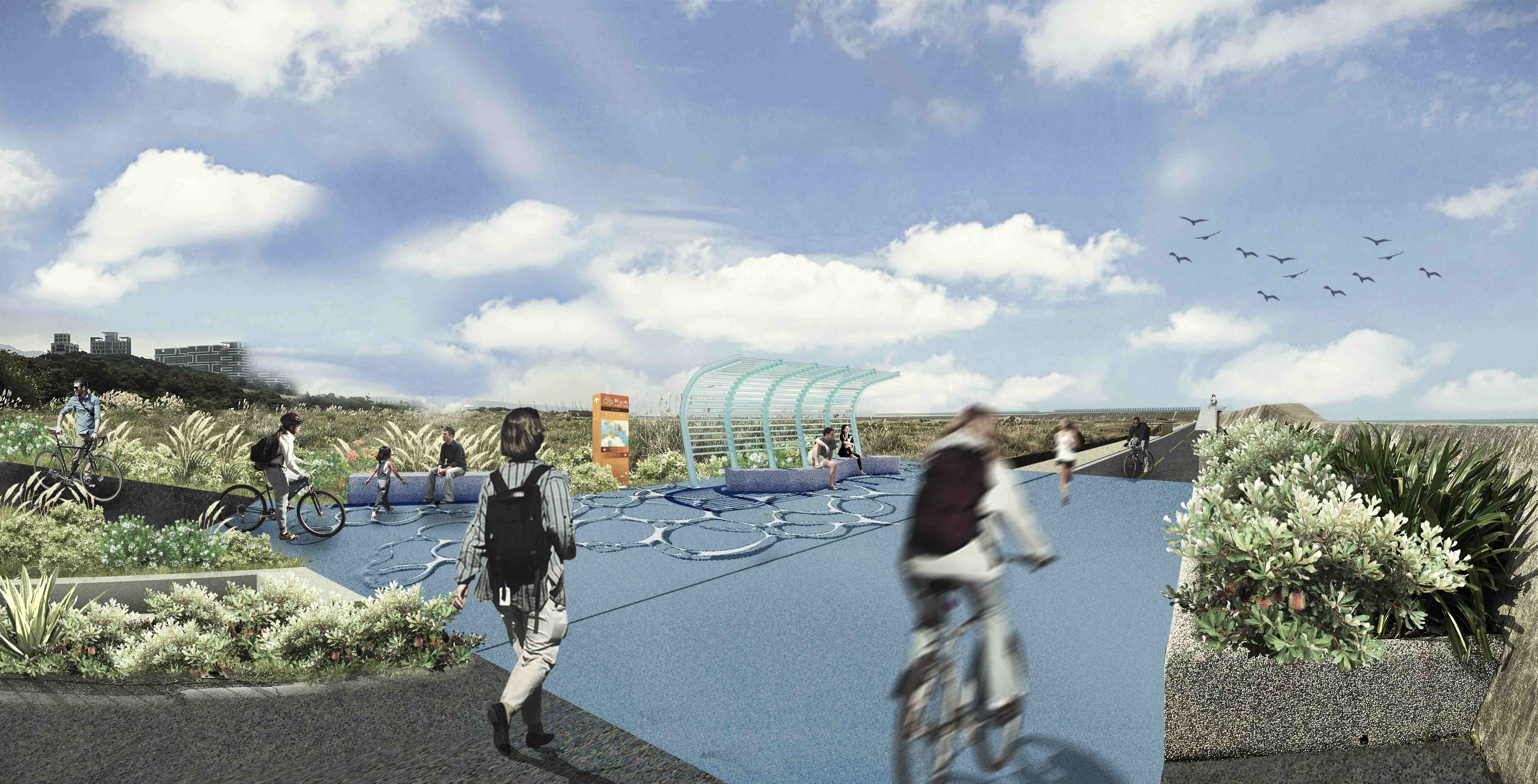 處長黃裕斌補充,海堤段總長約1.7公里,工程主要為拓寬自行車道,規劃以海天一線進行淨寬3公尺之堤頂自行車道建置,以高架鋼構橋落柱於海堤混凝土結構,與無限綿延海景結合,並藉優化既有的自行車道與入口標誌指引,提供更清楚、舒適的通行空間,提升金色水岸自行車道之串接性。新北河濱擁有全台最長河濱自行車道,共有七條自行車道長度218公里串聯北北基桃,是北台灣重要的河濱自行車道交通動脈,淡水金色水岸自行車道優化工程已陸續開工,沿線5段工程預計於116年完工。