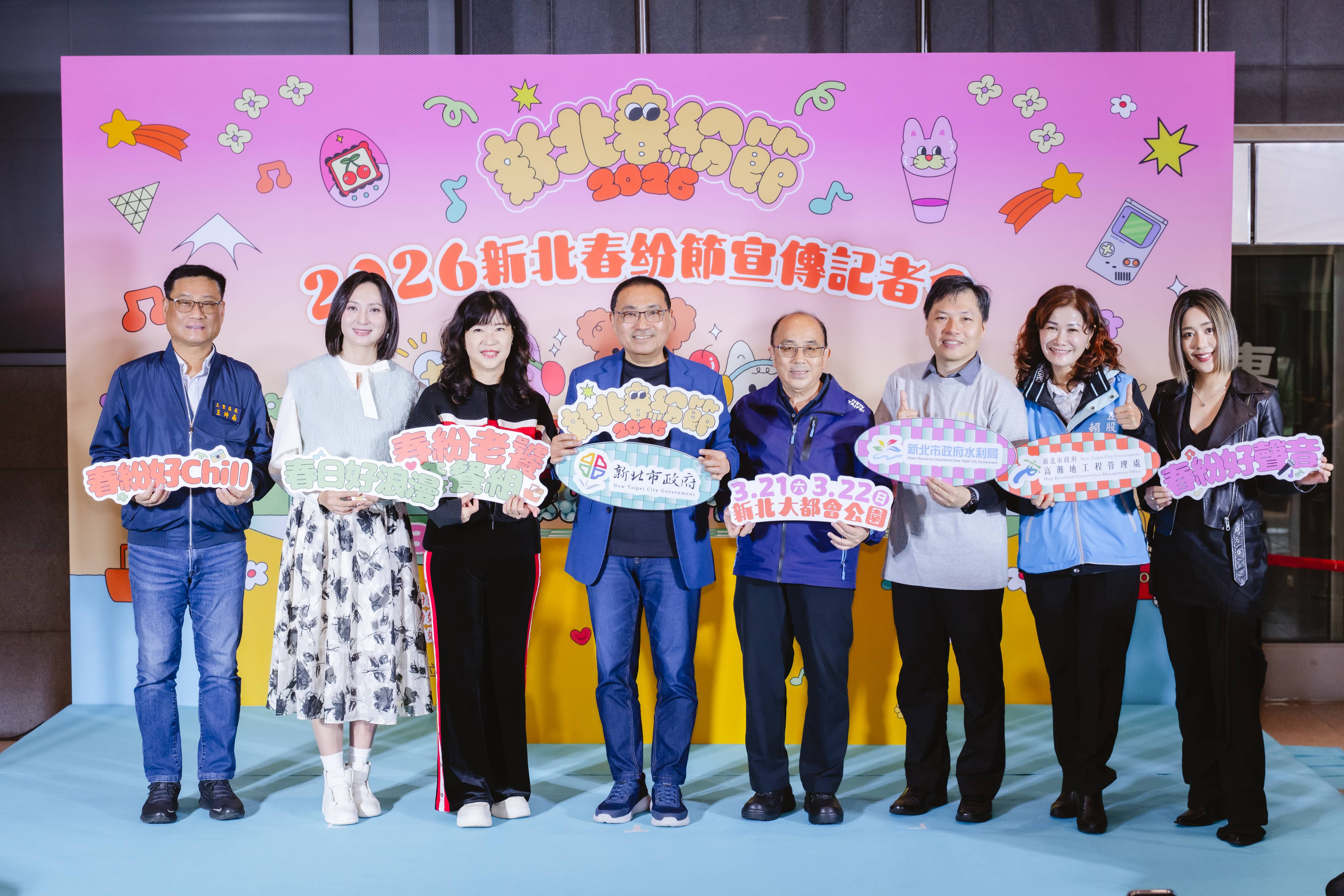 新北市長侯友宜出席記者會正式揭曉「2026 新北春紛節」年度亮點。今年的活動主視覺,特邀人氣插畫藝術家「卡肉老ㄙの波波冰狗室」跨界操刀,由筆下熱門 IP「波波冰狗室」的三位主角「趴皮」、「乖咪」與「柴柴」,帶領大眾重返最繽紛的青春年代。今年活動以「春紛好__」的留白哲學,分別策劃【春紛好聲音】、【春紛好Chill】和【春紛好自得】三大主題區,以「集體記憶」為語言,透過三大舞台交織出跨時代的共感時刻。