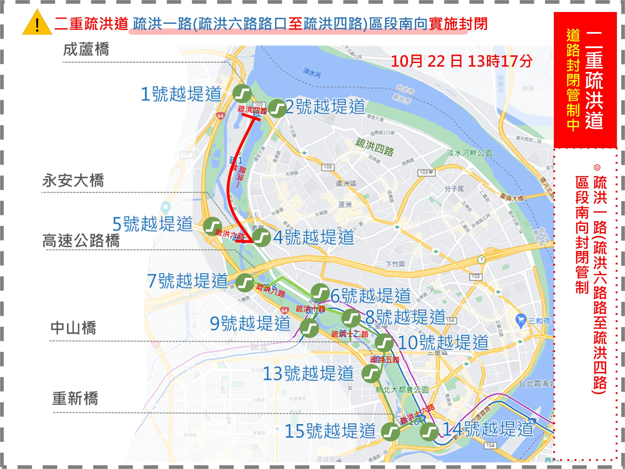 新北市訊:因114年10月22日豪大雨及抽水站抽水,二重疏洪道已積淹水,將管制疏洪一路(疏洪四路至疏洪六路南下路段)必要路段,為顧及民眾安全,市府已派員進行上開路段道路管制,切勿強行進入封閉路段。並提醒民眾提早配合改道,以確保民眾安全。